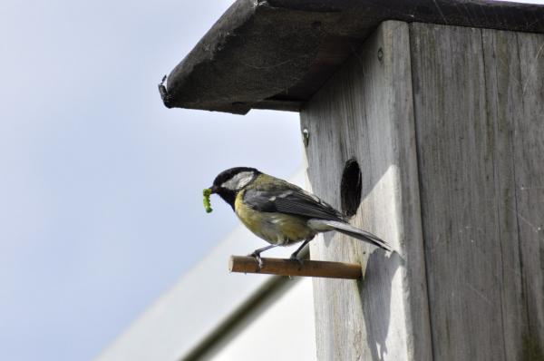 Koolmees brengt maar weer eens een rups naar de luid piepende jongen.